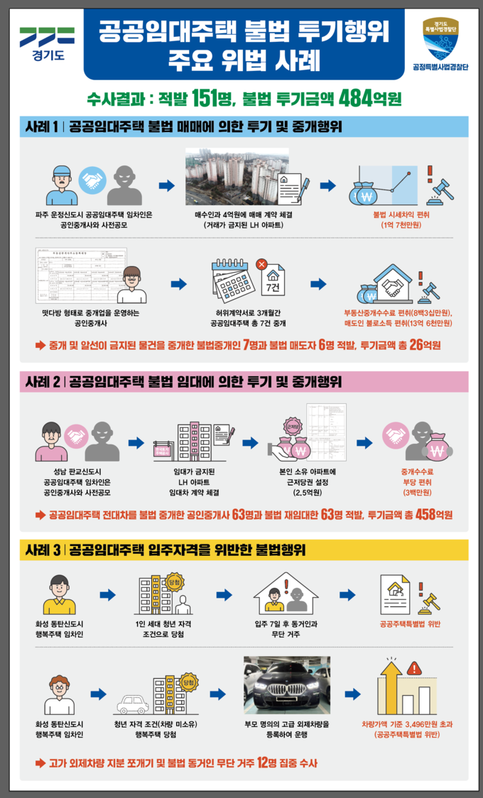 [정도일보 김제영 기자] 매매나 재임대가 금지된 공공임대주택을 시세차익을 노리고 불법으로 매매․임대한 불법 투기자와 공인중개사, 입주자격 위반행위자 등 151명이 경기도 특사경에 적발됐다. 이들이 투기한 금액은 484억 원에 달한다.