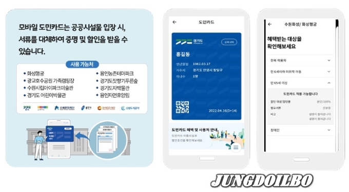 [정도일보 김제영 기자] 경기지역 공공시설 입장 할인 자격을 간편하게 확인해주는 ‘도민카드’ 적용 시설이 다음 달 중 기존 8곳에서 52곳으로 대폭 확대될 예정이다. 도민카드는 마이데이터를 활용한 맞춤형 정보서비스 ‘경기똑D’ 앱에서 사용가능하다.