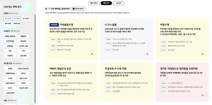 또, 관심 사항과 개인 특성을 선택하지 않아도 생애주기별 대표 정책을 바로 확인할 수 있는 기능도 추가했다. 여성청소년 생리용품 보편지원, 경기청년 결혼축하 복지포인트 지원, 어르신 방문구강 건강관리사업 확대 등 연령대별 주요 정책을 클릭 한 번으로 확인할 수 있다.