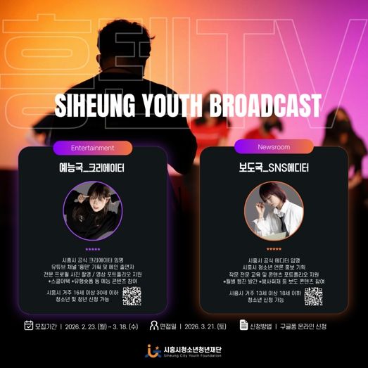 (정도일보) 시흥시청소년청년재단은 시흥시 청소년ㆍ청년의 미디어 활동 역량을 강화하고, 재단의 소통 기능을 확대하기 위해 ‘흥텐TV’를 운영하는 가운데, ‘흥텐TV’를 함께 이끌어갈 예능국·보도국 신규 단원을 3월 18일까지 모집한다.