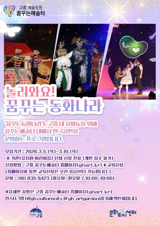 특히 이번 프로그램은 유치원과 어린이집 단위의 단체 관람으로만 운영되며, 개인 신청이나 개별 관람은 불가하다. 관람을 희망하는 관내 교육기관은 모집 기간 내 고흥 꿈꾸는예술터 홈페이지(ghart.kr)를 통해 신청하면 된다.