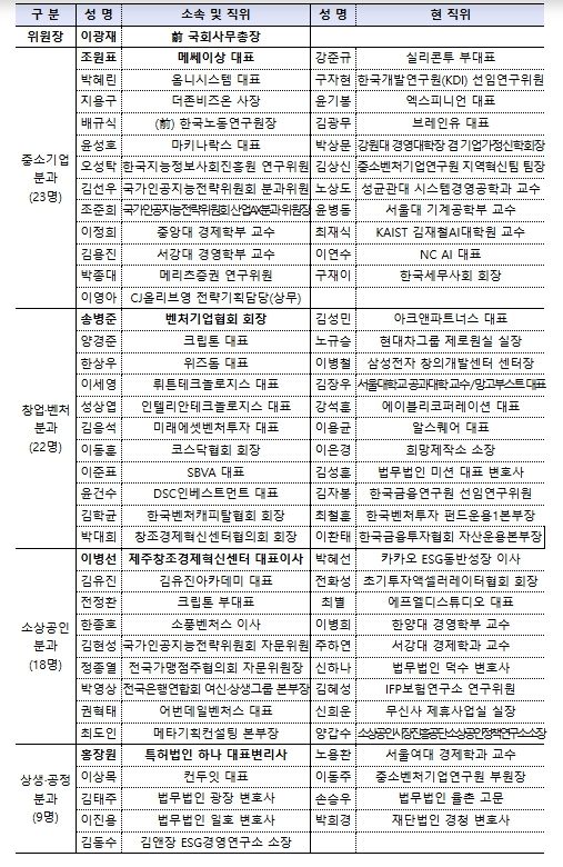 민관 정책협의회는 기업인, 민간 전문가, 학계, VC, 협·단체 등 총 72명의 위원으로 구성되어 출범일로부터 1년간 활동하게 된다. 또한 한성숙 중기부 장관과 이광재 전 국회사무총장이 공동위원장을 맡아 민관 정책협의회를 이끌어갈 예정이다.
