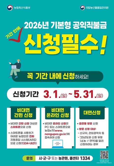 (정도일보) 강원특별자치도는 2026년 기본형 공익직불금 신청을 3월 1일부터 5월 31일까지 3개월간 접수한다고 밝혔다.