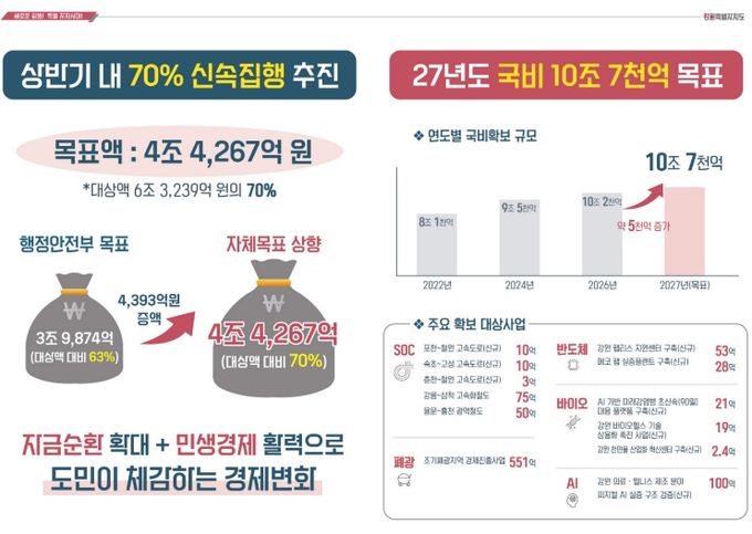 (정도일보) 강원특별자치도는 민생경제 활력을 위해 상반기 내 신속집행 대상 예산액의 70%인 4조 4,267억 원을 집행하고 2027년도 국비는 10조 7,000억 원 확보를 함께 추진해 나갈 계획을 밝혔다.