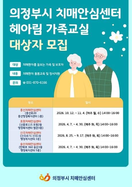 (정도일보) 의정부시 보건소 치매안심센터는 4월부터 치매환자 가족과 보호자의 돌봄 부담을 경감하고 정서적 지지를 돕기 위한 가족지원 프로그램 ‘기억돌봄교실’을 운영한다.