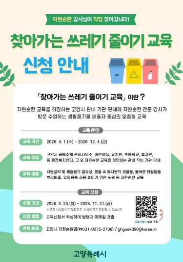 (정도일보) 고양특례시는 생활 속 자원순환 실천을 유도하기 위해 오는 4월부터 12월까지 9개월간 ‘2026년 찾아가는 쓰레기 줄이기 교육’을 운영한다.