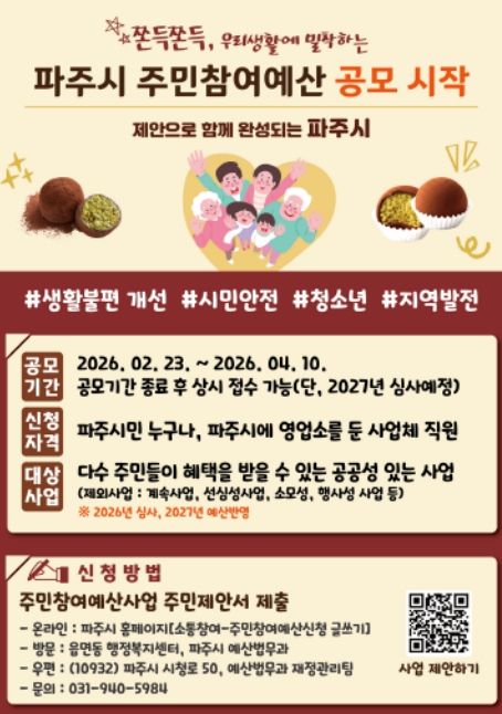 (정도일보) 파주시는 2027년도 예산 편성에 반영할 주민참여예산 시민 제안을 오는 4월 10일까지 접수한다.