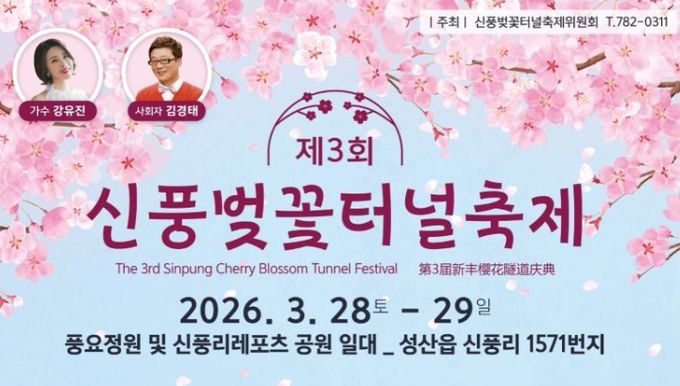 (정도일보) 서귀포시는 몸과 마음이 가벼워지는 따스한 봄, 가족・연인・친구 간의 잊지 못할 추억을 선사할 제3회 신풍벚꽃터널축제가 28일~29일 양일간 성산읍 풍요정원 및 신풍리레포츠 공원 일원에서 개최된다고 밝혔다.