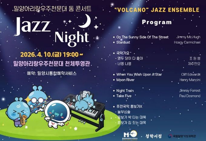 (정도일보) 밀양문화관광재단은 오는 4월 10일 밀양아리랑우주천문대 천체투영관에서 우주와 음악이 결합한 특별한 문화 행사 ‘재즈 나이트(Jazz Night)’를 개최한다.
