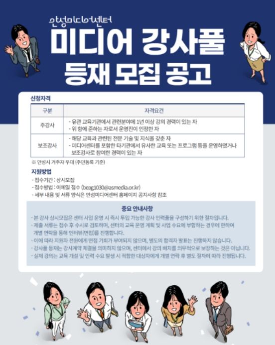 (정도일보) 안성시는 4월 1일부터 보다 체계적이고 전문적인 미디어 교육 운영을 위해 ‘미디어 강사풀’ 등재 강사를 상시 모집한다.