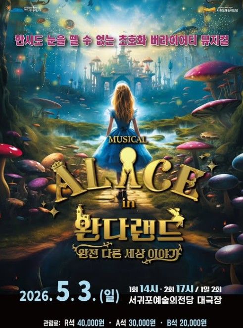 (정도일보) 서귀포예술의전당은 5월 가정의 달을 맞아 뮤지컬 '이상한 나라의 앨리스: 완다랜드'를 5월 3일 오후 2시와 5시, 총 2회에 걸쳐 서귀포예술의전당 대극장에서 선보인다.
