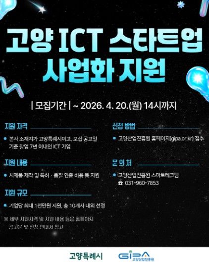 (정도일보) 고양산업진흥원이 ‘2026년 고양 ICT 스타트업 사업화 지원사업’ 참여 기업을 모집한다.