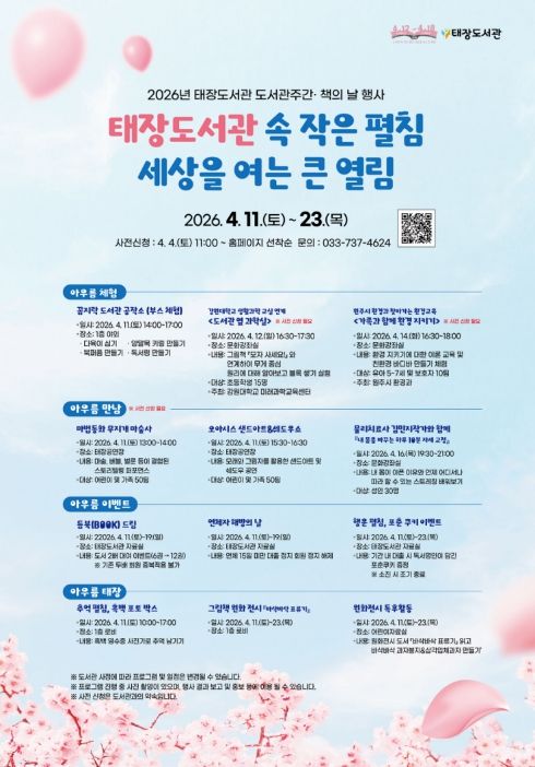 (정도일보) 원주시 태장도서관은 도서관 주간 및 책의 날을 맞이해 오는 11일부터 23일까지 ‘태장도서관 속 작은 펼침, 세상을 여는 큰 열림’을 주제로 다양한 행사를 개최한다.