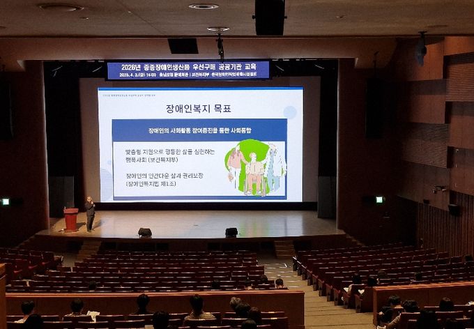 (정도일보) 충남도는 3일 도청 문예회관에서 중증장애인 생산품 우선구매 관련 공공기관의 인식 제고 및 구매 독려를 위한 ‘2026년 공공기관 중증장애인생산품 우선구매 교육’을 실시했다.