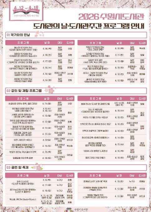 (정도일보) 수원시도서관이 제62회 도서관주간(4월 12~18일)을 맞아 ‘도서관 속 작은 펼침, 세상을 여는 큰 열림’을 주제로 다양한 독서문화 프로그램을 운영한다.