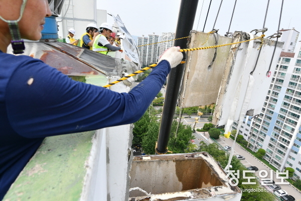 20일에는 철거 사전 준비로 아파트 본건물과 환기 구조물을 밴드로 고정시키는 전도 방지 작업을 했다.
