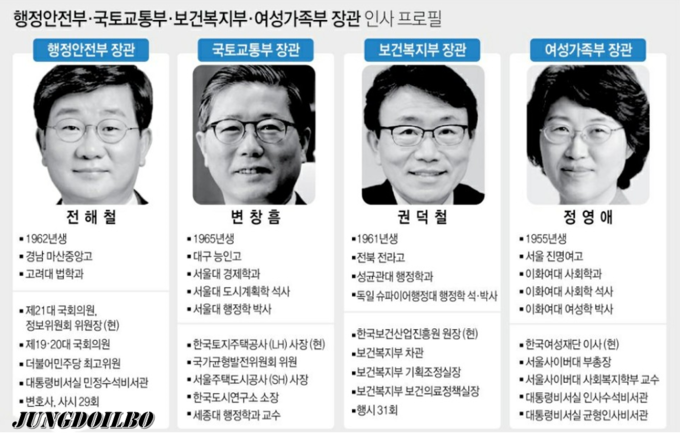 .또 행정안전부 장관엔 더불어민주당 정해철 의원이 내정됐다. 전 내정자는 노무현 정부 시절 청와대 민정비서관과 민정 수석을 지낸 3선 의원으로, 친문(친문재인) 핵심인 '3철'(전해철·이호철·양정철) 가운데 한 명이다.