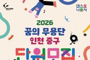 (정도일보) (재)인천중구문화재단(이사장 김정헌)은 2026 꿈의 무용단 ‘인천 중구’의 신규 단원을 모집한다고 4일 밝혔다. ‘꿈의 무용단’은 문화체육관광부가 주최하고 한국문화예술교육진흥원이 주관하는 꿈의 예술단 사업으로, 인천중구문화재단은 4년 차 거점기관으로서 현대무용 기반의 무용예술교육을 안정적으로 운영해 오고 있다. 모집 대상은 인천 지역 거주 또는 소재 학교 재학 중인 아동·청소년(8세~18세)이며, 모집 기간은 2월 26일부터 3월 18일까지다. 중구·동구 거주자(또는 관내 학교 재학생)는 선발 시 우대한다. 이번 2026 꿈의 무용단 ‘인천 중구’는 현대무용 기반 문화예술교육을 통해 아동·청소년의 표현력과 공동체 역량을 키우는 성장형 프로그램이다. 무엇보다 과정 중심의 교육을 통해 참여 경험의 가치를 높이고자 한다. 재단은 온라인 접수 후 오디션을 통해 단원을 최종 선발할 방침이다. 선발된 단원은 4월부터 11월까지 정기 교육과정과 정기 공연에 참여하게 된다. 교육은 기초 신체 훈련과 움직임 탐색, 즉흥 활동, 레퍼토리 창작 등 단계별 프로그램으로 운영될 예정이다. &nb
