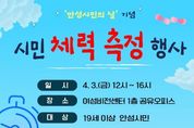 (정도일보) 안성시보건소는 ‘안성 시민의 날’을 맞아 시민의 건강 증진과 올바른 생활 습관 형성을 돕기 위한 ‘시민 체력 측정 행사’를 개최한다고 밝혔다. 이번 행사는 오는 4월 3일 오후 12시부터 4시까지 안성시 여성비전센터 1층 공유오피스에서 진행된다. 현장에서는 체력 측정뿐만 아니라 심뇌혈관 질환 예방, 신체활동, 금연, 구강 관리 등 건강 인식 향상을 위한 다양한 건강증진 부스도 함께 운영될 예정이다. 체력 측정은 1인당 약 30분이 소요되며, 원활한 운영을 위해 오는 3월 27일까지 선착순 80명을 대상으로 사전 접수를 받는다. 신청은 홍보물에 포함된 QR코드 또는 온라인 설문 링크를 통해 할 수 있다. 당일 현장 접수도 가능하지만, 대기 시간이 발생할 수 있어 사전 예약이 권장된다. 상세 측정 절차는 ▲혈압 체크 ▲체격 검사(신장, 체중, 체성분 분석) ▲근력 측정 ▲심폐지구력(65세 이상은 협응력) 측정 순이며, 측정 후에는 결과지 제공과 함께 1:1 맞춤형 상담이 이뤄진다. 단, 안전을 위해 행사 당일 혈압이 고혈압 기준(수축기 160mmHg 또는 이완기 100mmHg 이상)을 초과할 경우 참여