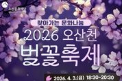 (정도일보) 오산문화재단은 오는 4월 3일 오후 6시 30분 오산천 야외무대(종합운동장 뒤편)에서 시민들과 함께하는 봄맞이 ‘2026 오산천 벚꽃 축제’를 개최한다. 이번 행사는 따뜻한 봄의 시작을 알리며 시민들에게 특별한 추억을 선사하기 위해 마련된 것으로, 가수 황민호의 축하 공연을 비롯해 점등식과 폭죽 퍼포먼스가 어우러져 오산천 일대를 화려한 봄밤의 분위기로 물들일 예정이다. 행사 당일에는 음악과 빛, 불꽃이 조화를 이루는 다양한 프로그램이 진행되며, 남녀노소 누구나 함께 즐길 수 있는 열린 문화행사로 시민들의 큰 호응이 기대된다. 오산문화재단 관계자는 “오산천에서 펼쳐지는 이번 축제가 시민들에게 특별한 봄밤의 추억으로 남길 바란다”며 “앞으로도 시민들이 일상 가까이에서 문화와 예술을 향유할 수 있도록 다양한 프로그램을 지속적으로 마련하겠다”고 밝혔다.