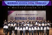 (정도일보) 용인특례시는 30일 시청 에이스홀에서 ‘제72회 경기도체육대회 2026 광주’에 참가하는 선수단 출정식을 개최했다. 제72회 경기도체육대회는 4월 16일부터 18일까지 3일간 광주시 일원에서 열리며, 용인특례시는 육상, 축구, 태권도 등 26개 종목에 선수 312명이 출전한다. 출정식에는 이상일 시장을 비롯해 체육회 임원과 종목단체장, 선수단 등 약 300명이 참석했다. 이상일 시장은 격려사를 통해 “그동안 대회를 위해 열심히 준비해 온 선수단 여러분들 정말 자랑스럽다”며 “이번 대회에서 갈고닦은 실력을 마음껏 발휘해 원하는 성과 거두시길 바라고, 모두가 한 단계 더 성장하는 계기가 되길 바란다”고 말했다. 이 시장은 “선수들이 더 좋은 환경에서 훈련하고 기량을 펼칠 수 있도록 지원을 확대하기 위해 노력하고 있다”며 “앞으로도 여러분과 함께 힘과 지혜를 모아 오늘보다 더 나은 내일을 만들어가겠다”고 했다. 이 시장은 출정식 이후 집무실에서 직장운동경기부 감독과 종목단체 회장단을 대상으로 간담회를 열어 선수단을 격려하고, 현장의 애로사항과 건의사항을 청취했다. 간